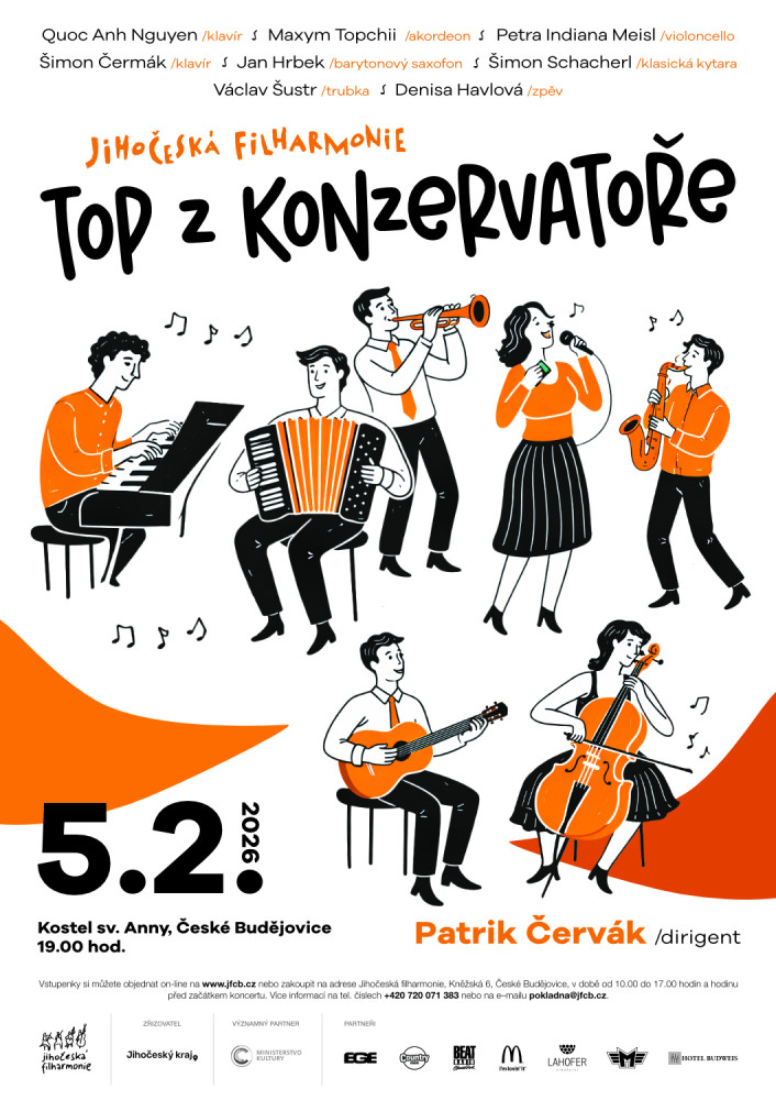 Srdečně vás zveme na koncert TOP Z KONZERVATOŘE, který se uskuteční 5. února v Kostele sv. Anny. Vybraní sólisté z řad našich studentů vystoupí za doprovodu Jihočeské filharmonie pod taktovkou dirigenta Patrika Červáka.